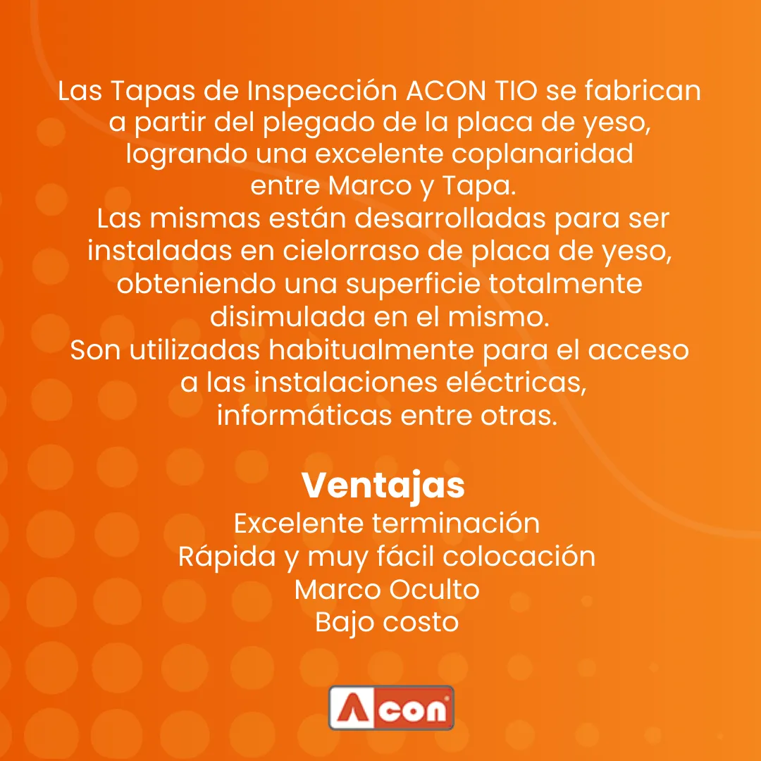 Las Tapas de Inspección ACON TIO se fabrican a partir del plegado de la placa de yeso, logrando una excelente coplanaridad entre Marco y Tapa. Las mismas están desarrolladas para ser instaladas en cielorraso de placa de yeso, obteniendo una superficie totalmente disimulada en el mismo. Son utilizadas habitualmente para el acceso a las instalaciones eléctricas, informáticas entre otras.